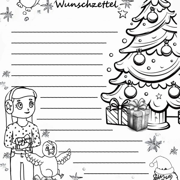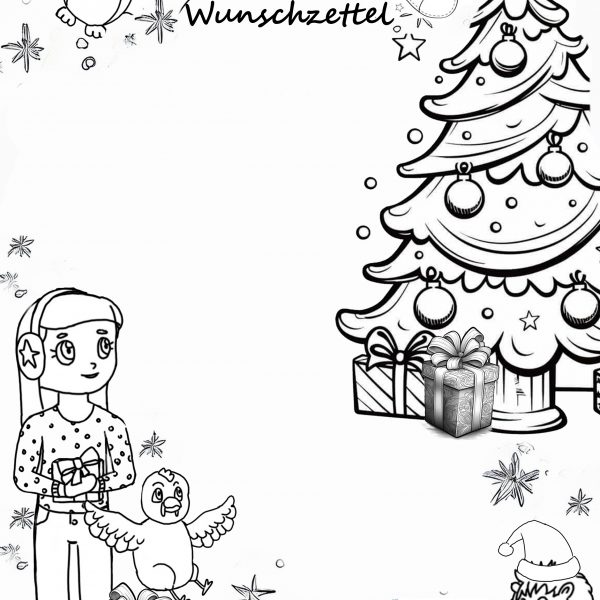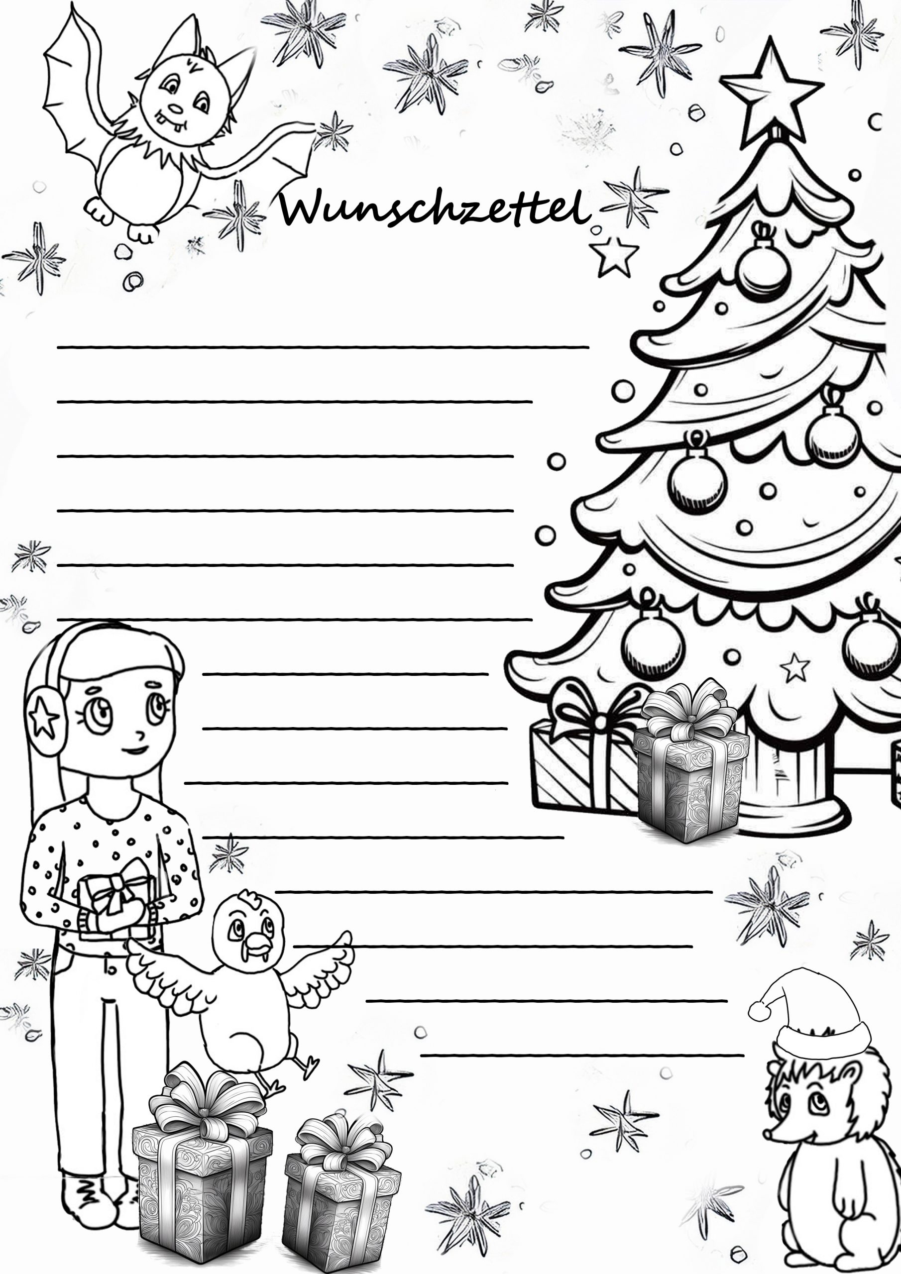 Dein Wunschzettel Ausmalbild mit Titu, Freddy und Ina Chickerella