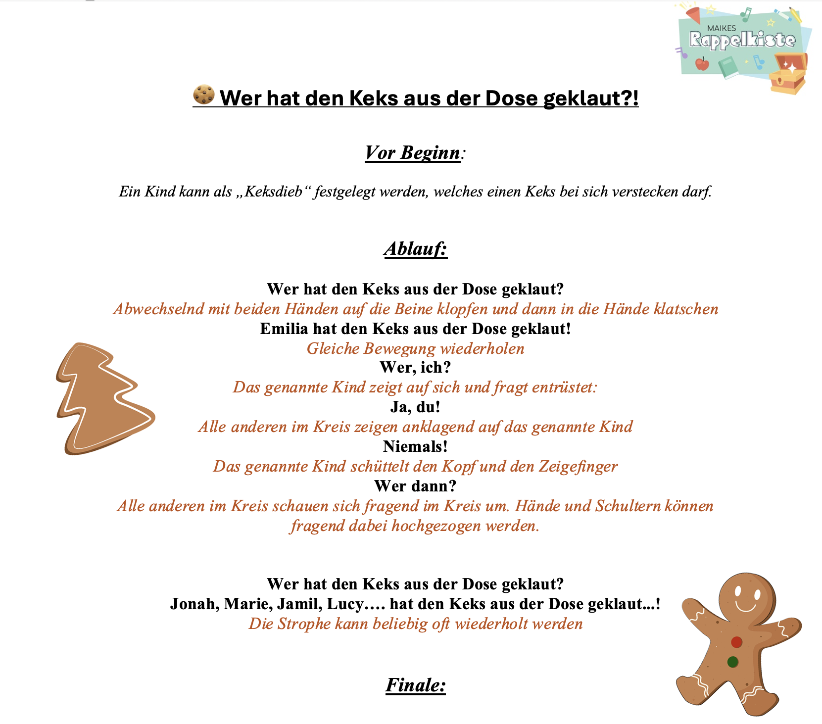 Dieses Rhythmusspiel steigert die Spannung, wer wohl der geheimnisvolle „Keksedieb“ war – und macht eure weihnachtlichen Stuhlkreise, Gruppenstunden oder Familienmomente noch gemütlicher.